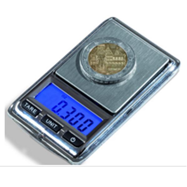 Bilancia digitale per monete Libra Mini, nel pratico formato tascabile con dispay LCD retroilluminato con spegnimento automatico, 6 diverse unità di peso, funzione tara e ampio piano di pesatura in acciaio inox, coperchio amovibile, campo di pesatura da 0,01 a 100 grammi, dimensioni esterne 45x76x13, fornita di batteria.