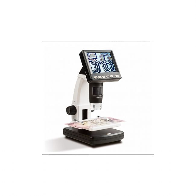 Microscopio digitale LCD DM 10-500 x, con schermo LCD da 3,5, questo microscopio digitale è di facile utilizzo e non richiede il collegamento a PC o laptop. Il sensore attivo da 5 megapixel, la lampada a 8 LED e la messa a fuoco regolabile consentono una straordinaria chiarezza e nitidezza delle immagini. Grazie allo zoom digitale quadruplo sono possibili ingrandimenti fino a 500x. Le immagini e i video possono essere salvati sulla scheda SD da 4 GB inclusa nella confezione e visualizzati al PC mediante cavo USB 2.0 o sullo schermo del televisore tramite la porta AV. La batteria ricaricabile agli ioni di litio consente di portare il microscopio ovunque si desideri senza che vi sia il bisogno di collegarlo a una presa di corrente o a un PC. Il software in dotazione, semplice e veloce sia da installare sia da utilizzare,grazie alla sua funzione di calibrazione, consente di misurare con precisione le distanze e le superfici degli oggetti osservati. Il microscopio digitale LCD è perfetto per una molteplicità di usi, ad esempio per lo studio, la scuola o il tempo libero, e consente di osservare da vicino tutti i dettagli di francobolli, monete, banconote, minerali e molto altro ancora. Adatto a tutti i sistemi di computer standard. Formato esterno: 105 x 230 x 150 mm.