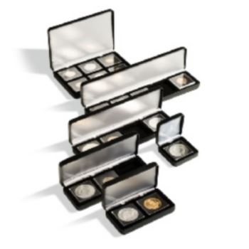 Astucci per monete, esterno in similpelle e interno degli astucci in metello rivestito in tessuto seta opaca e velluto nero. Eleganti e leggeri nonchè resistenti sono disponibili in vari dimensioni, per contenere da 1 moneta a 6 monete.