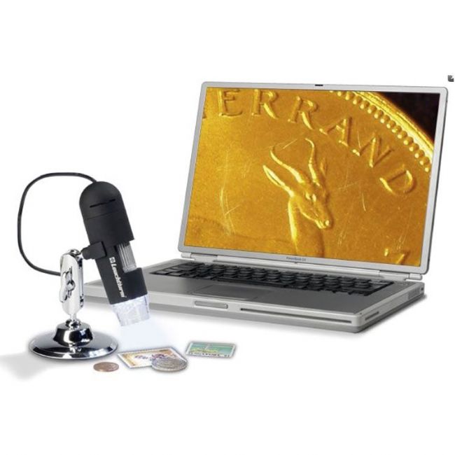 Microscopio digitale USB essenziale per scoprire dettagli che non sono invisibili a occhio nudo, ideale per monete, francobolli banconote e tanto altro ancora, il software incluso consente di scattare foto e giare video che sarà poi possibile salvare, facile da usare e si adatta a tutti i sistemi di computer standard. Ingrandimento da 20 a 200x, 8 luci bianche LED, alimentazione USB. E' inoltre disponibile in aggiunta un robusto stativo (non incluso con il microscopio) con base molto ampia, scala di misurazione, clip e un'asta particolarmente alta (40,5 cm) che permette di osservare e riprendere per intero monete, francobolli o oggetti particolarmente grandi, inoltre il supporto del microscopio si può far scorrere in alto e in basso grazie a una guida mobile.