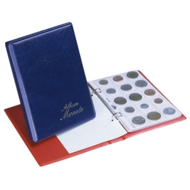 Raccoglitore per monete tascabile a pagine mobili a taschine con meccanismo a due anelli, completo di cinque inserti in cristal trasparente e supporto in carta bianca. All'interno del raccoglitore i fogli disponibili sono da 6, 8 o 15 monete.