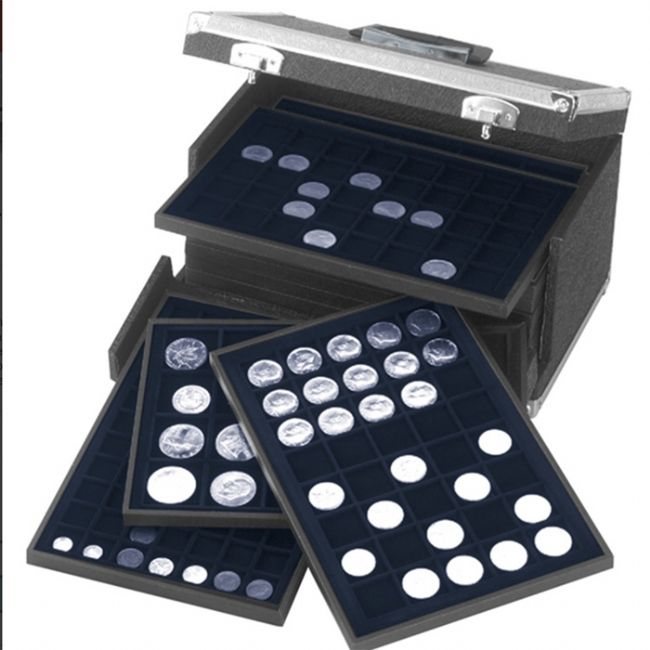 Valigetta Bauletto per monete è rivestito in semilpelle nera con angoli protetti da bordature in metallo, maniglia collocata sul lato superiore per mantenere i vassoi (non inclusi nel prezzo) sempre orizzontali anche durante gli spostamenti, chiusure con cerniere. Ideale per la sistemazione la conservazione e il trasporto delle vostre monete.