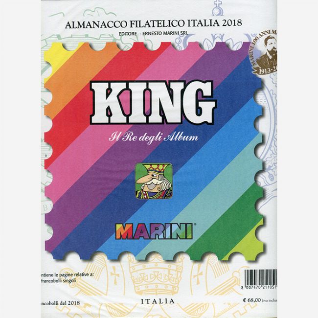 Album King, versione classica della Marini per raccolta dei francobolli della Repubblica Italiana anno 2018. L'edizione più diffusa e apprezzata, caratterizzata dall'esclusiva taschina monolembo e la descrizione in lingua italiana. Dal 1978 la versione King Classica è arricchita dall'Almanacco Filatelico Marini che riporta ampie notizie storico illustrative su ciascuna emissione. I fogli a 22 fori sono nel classico formato Marini 268x290 mm, all'interno di ogni casella è raffigurata la riproduzione miniaturizzata del francobollo e sopra la figura sono indicati data tiratura e descrizione del francobollo.