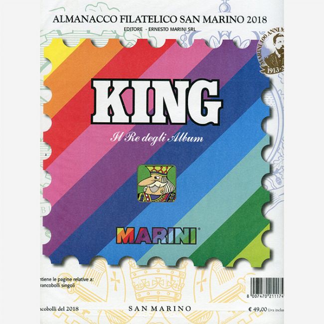 Album King, versione classica della Marini per raccolta dei francobolli della Repubblica di San Marino anno 2018. L'edizione più diffusa e apprezzata, caratterizzata dall'esclusiva taschina monolembo e la descrizione in lingua italiana. Dal 1978 la versione King Classica è arricchita dall'Almanacco Filatelico Marini che riporta ampie notizie storico-illustrative su ciascuna emissione. I fogli a 22 fori sono nel classico formato Marini 268x290 mm, all'interno di ogni casella è raffigurata la riproduzione miniaturizzata del francobollo e sopra la figura sono indicati data tiratura e descrizione del francobollo. Inoltre sono disponibili anche i seguenti prodotti per quartine, minifogli, emissioni congiunte, cartoline e fogli aggiornamento versione Europa: