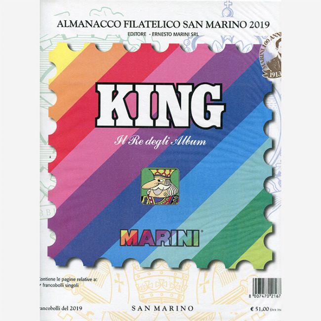 Album King, versione classica della Marini per raccolta dei francobolli della Repubblica di San Marino 2019. L'edizione più diffusa e apprezzata, caratterizzata dall'esclusiva taschina mono lembo e la descrizione in lingua italiana. Dal 1978 la versione King Classica è arricchita dall'Almanacco Filatelico Marini che riporta ampie notizie storico illustrative su ciascuna emissione. I fogli a 22 fori sono nel classico formato Marini 268x290 mm, all'interno di ogni casella è raffigurata la riproduzione miniaturizzata del francobollo e sopra la figura sono indicati data tiratura e descrizione del francobollo.