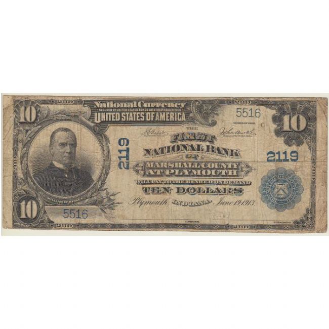 Banconota da 10 Dollari emessa dalla First National Bank Notes degli Stati Uniti d'America nel 1913, al fronte della cartamoneta nel tondo a sinistra busto di William McKinley a destra contrassegno bollino blu. Al rovescio la figura femminile che rappresenta la Libertà e Progresso in piedi al centro della banconota sullo sfondo delle navi in mare aperto.