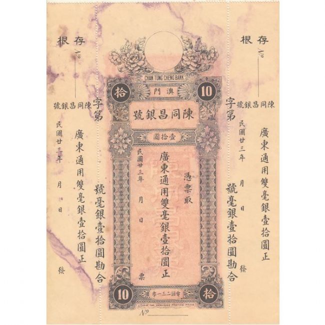 Macau (Macao) 1934, Portuguese Chan Tung Cheng Bank, 10 Dollars, S92. Al retro della banconota nella parte centrale in rosso edificio del Governo.