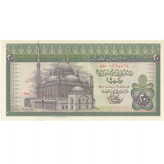 Banconota da 20 pounds Egitto 1976. Nel fronte della banconota Moschea Mohammed Ali a sinistra e leggenda araba a destra, nel retro carro da guerra arcaico a sinistra e immagini di fregio al centro destra.
