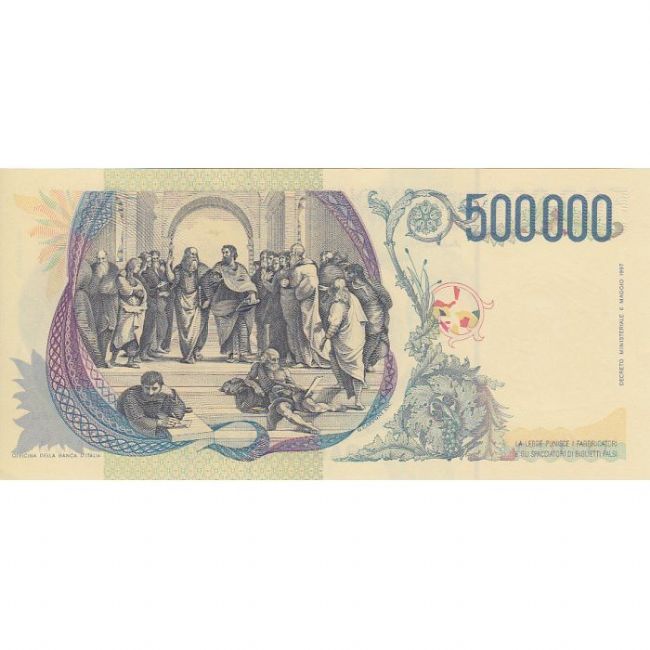 Banconota della Repubblica Italiana, taglio da 500.000 Lire Raffaello Sanzio. Emissione Banca d'Italia, anno 1997. Nel fronte a destra della banconota autoritratto di Raffaello Sanzio, al centro riproduzione dell'affresco "Il trionfo di Galatea" custodito nella Villa Farnesina in Roma, al retro la riproduzione dell'affresco "La scuola d'Atene" custodito dal Vaticano. Nella filigrana autoritratto di Raffaello. Monogramma "BI". Contrassegno di Stato Leone di San Marco e Repubbliche Marinare. Firme del Governatore e del Cassiere di Fazio-Amici.