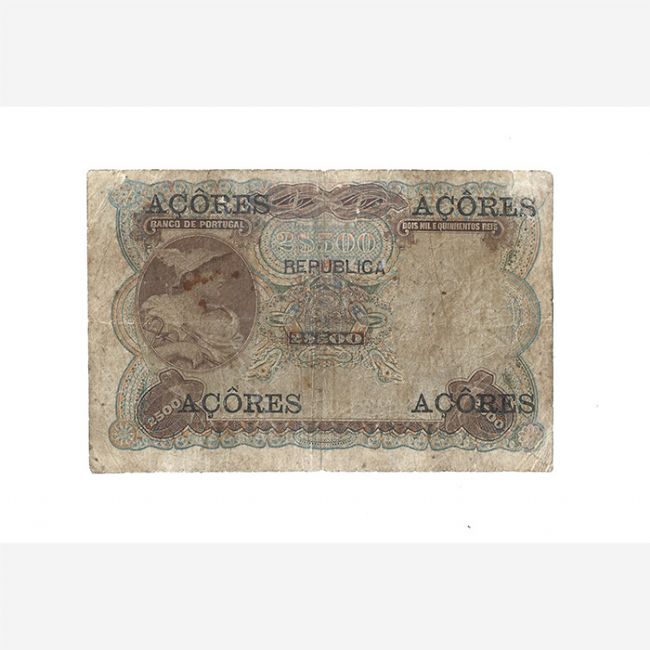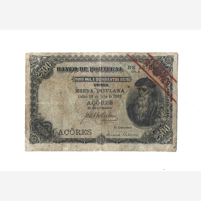 Banconote mondiali, Azzorre 2500 Reis Prata 1909. BANCO DE PORTUGAL. DOIS MILE QUINHENTOS REIS. PRATA. MOEDA INSULANA. Lisbona 30 de lulho de 1909. ACORES O governador. ACORES. Pik 8b