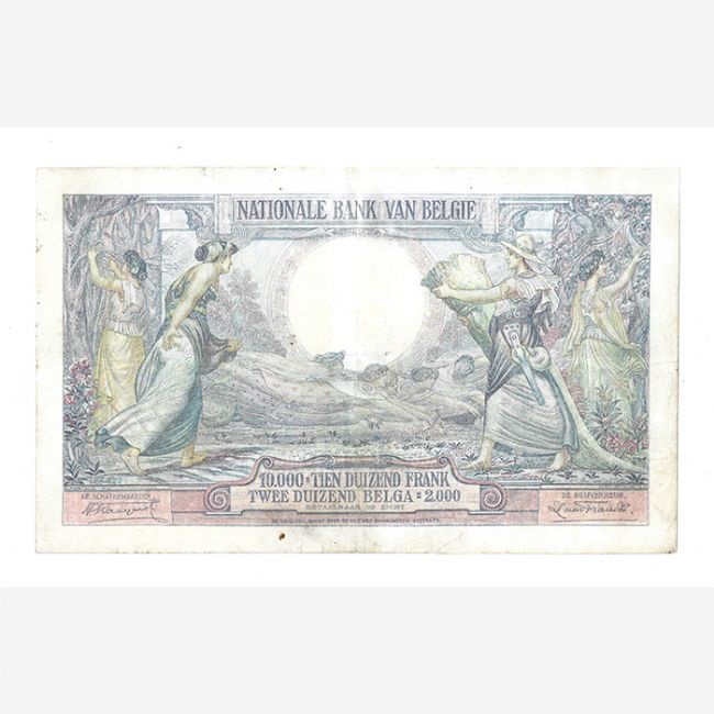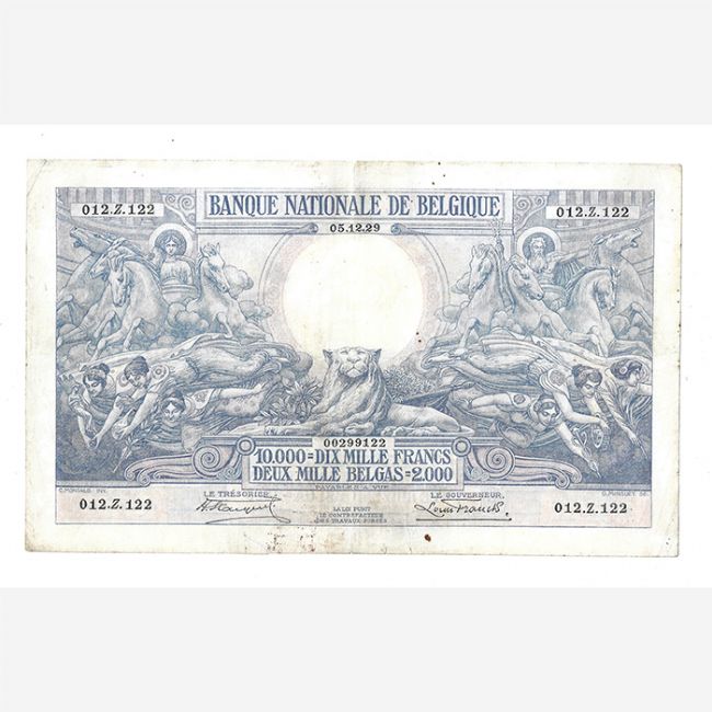 Banconote mondiali, Belgio 10000 Franchi 1929, Pik. 105. Al dritto della banconota: BANQUE NATIONALE DE BELGIQUE -05.12.29- 10.000 DIX MILLE FRANCS - DEUX MILLE BELGAS 2.000. Al rovescio: NATIONALE BANK VAN BELGIE - 10.000 TIEN DUIZEND FRANK - TWEE DUIZEND BELGA 2.000 -
