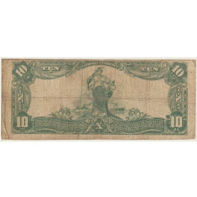 Banconota da 10 Dollari emessa dalla First National Bank Notes degli Stati Uniti d'America nel 1913, al fronte della cartamoneta nel tondo a sinistra busto di William McKinley a destra contrassegno bollino blu. Al rovescio la figura femminile che rappresenta la Libertà e Progresso in piedi al centro della banconota sullo sfondo delle navi in mare aperto.