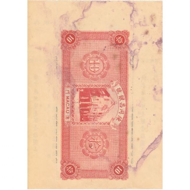 Macau (Macao) 1934, Portuguese Chan Tung Cheng Bank, 10 Dollars, S92. Al retro della banconota nella parte centrale in rosso edificio del Governo.
