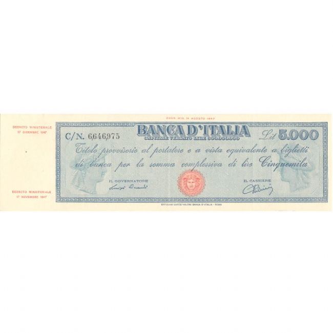 Banconota da 5.000 lire titolo provvisorio, Repubblica Italiana, anno 17 dicembre 1947. Al fronte nei due lati della banconota due profili di teste dell'Italia, al retro grande scritta 5.000 LIRE. Contrassegno Medusa e firme del Governatore Einaudi e del Cassiere Urbini.