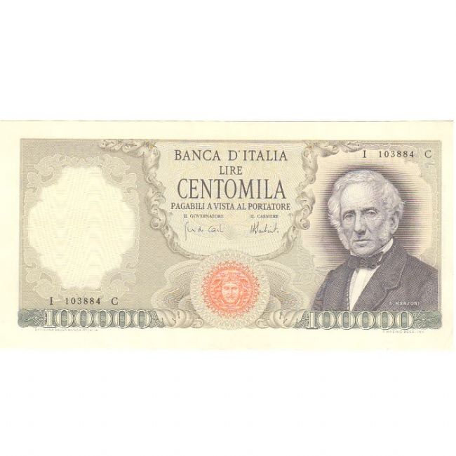 Banconota della Repubblica Italiana da 100.000 Lire Alessandro Manzoni, anno 6 febbraio 1974, in circolazione dal 1967 al dicembre 1982, al fronte della banconota sulla destra busto di Alessandro Manzoni, al rovescio scorcio panoramico del lago di Como con vista della città di Lecco, filigrana: nell'ornato sinistro testa femminile laureata, contrassegno della banconota la Medusa, firme del Governatore Carli e del Cassiere Barbarito.