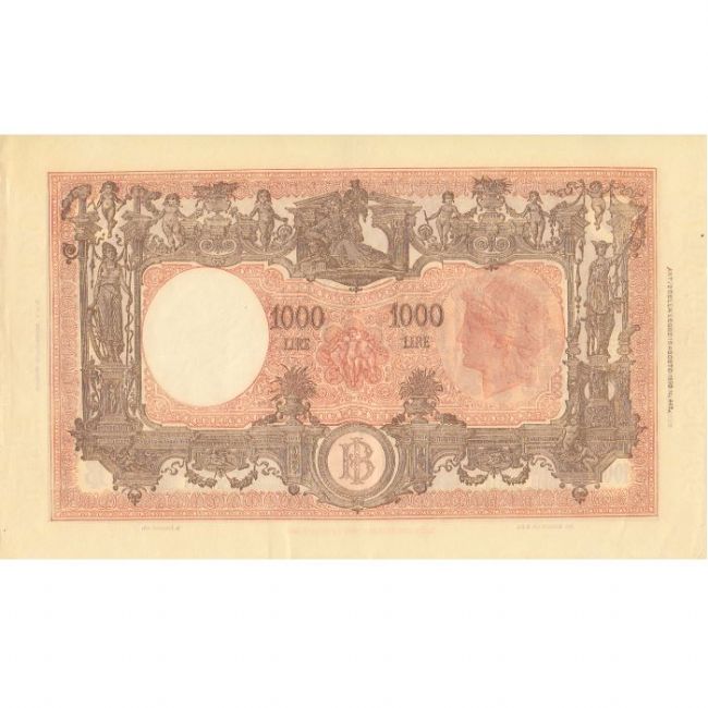 Banconota Repubblica Italiana da 1.000 lire detta Grande "M", datata 19 maggio 1947. Firme del Governatore Einaudi e dal Cassiere Urbini. Nel fronte della banconota stemma Sabaudo coronato e sorretto da due figura alate, nella sinistra grande M, sotto contrassegno Testina d'Italia. Nel retro in alto uomo barbuto rappresenta il Credito che regge una cornucopia, nella sinistra allegoria dell'Industria, nell'ovale a destra testa dell'Italia turrita, sotto contrassegno "BI"