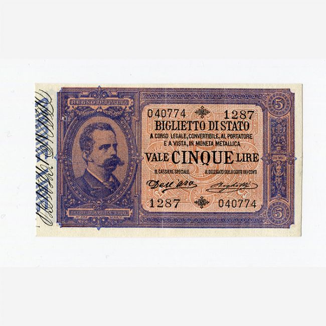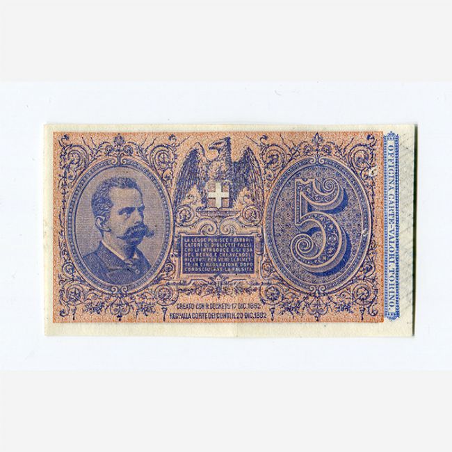 Al dritto della banconota busto del Re Umberto I entro un medaglione, al rovescio busto del Re a sinistra, al centro della banconota aquila con scudo reale, a destra grande cifra 5.