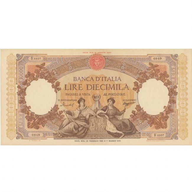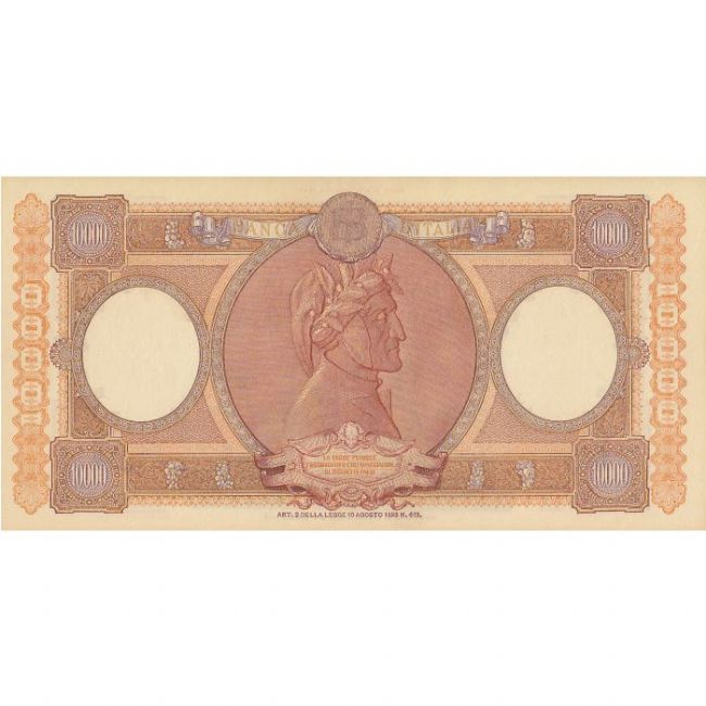 Banconota Repubblica Italiana da 10.000 Lire con data 22 febbraio 1958, firme del Governatore Menichelli e il Cassiere Boggione. Nel fronte della banconota all'interno dell'ovale di sinistra nella filigrana immagine di Michelangelo e nell'ovale di destra Galileo e contrassegno in basso della medusa, nel retro busto grande di Dante al centro della banconota e in basso il contrassegno monogramma Banca d'Italia "BI".