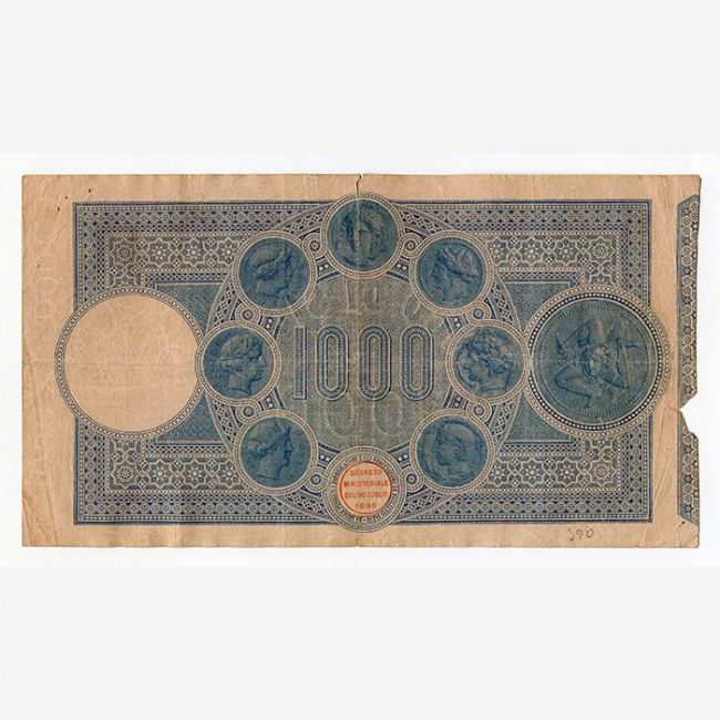 Regno d'Italia, Vittorio Emanuele III, Banco di Sicilia, banconota da 1000 Lire anno 24/12/1013, firme di Cosenz/Bortolotti. Al fronte della banconota al centro la cifra 1000 su cui sovrasta la scrtitta Banco di Sicilia, a destra nel tondo testa di Aretusa, a sinistra la statua del Palermo scolpita dal Marabutti, nella fascia superiore gli stemmi delle città di Palermo, Messina, Catania, Girgenti e Trapani, mentre in quella inferiore Siracusa e Caltanisetta. Nel retro del biglietto la cifra 1000 e nel tondo a destra la Trinacria.