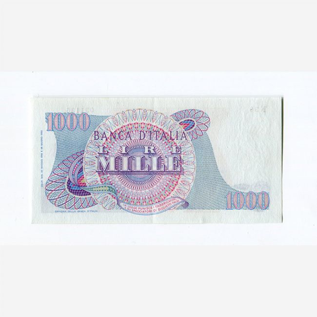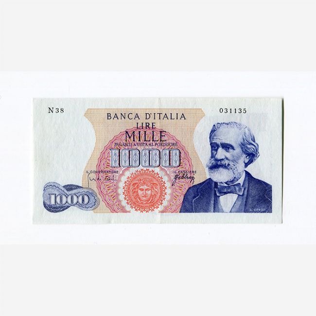 Repubblica Italiana, banconota da 1000 Lire Giuseppe Verdi 1° tipo con data 20-05-1966. Al fronte della banconota busto di Giuseppe Verdi, al rovescio valore "LIRE MILLE" in cifre e in lettere. Firme: Carli-Febbraio, filigrana: disposte verticalmente testine di Apollo, contrassegno di Stato: Medusa, stampata dall'Istituto Poligrafico dello Stato, Roma. In circolazione dal 3 dicembre 1963 e fuori corso il 1 luglio 1973.