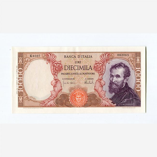 Repubblica Italiana, banconota da 10.000 Lire Michelangelo Buonarroti, con data 15-02-1973. Al dritto della banconota a destra busto di Michelangelo, al rovescio la veduta del Palazzo e Piazza del Campidoglio a Roma. Firme: Carli-Barbarito, filigrana: nell'ovale sinistro testina del David di Michelangelo, contrassegno di Stato: Medusa, stampata dall'officina della Banca d'Italia, Roma. In circolazione dal 3 dicembre 1963 e fuori corso dal 31 luglio 1983.