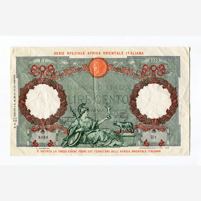 Cartamoneta Italiana, Vittorio Emanuele III, serie speciale Africa Orientale Italiana, banconota da 100 lire 1938 tipo Aquila Romana. Al fronte della banconota in basso la dea Roma semisdraiata con scudo e vittoria alata, alla sua destra Lupa Capitolina, firme Azzolini-Urbini. Al retro corona d'alloro entro cui poggia Aquila Romana. Filigrana: all'interno del medaglione a destra testa di Dante Alighieri, a sinistra la testa dell'Italia Turrita. Fuori corso in AOI nel maggio 1942, in Italia dal 30 giugno 1950.