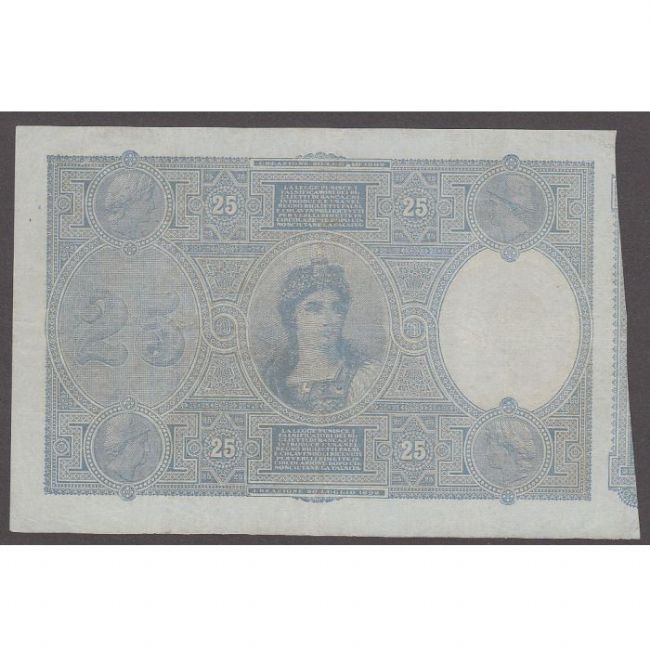 Banconota da 25 lire emessa dalla Banca Nazionale nel Regno d'Italia datata 20 luglio 1892 sotto il Regno di Umberto I. Nel fronte della banconota è rappresentato in alto stemma sabaudo coronato e sotto figura femminile seduta con tre putti, nel retro medaglione con busto dell'Italia. Filigrana: Testa di Roma con elmo crestato. Nel lato sinistro del biglietto matrice con la scritta arabescata "BANCA NAZIONALE".