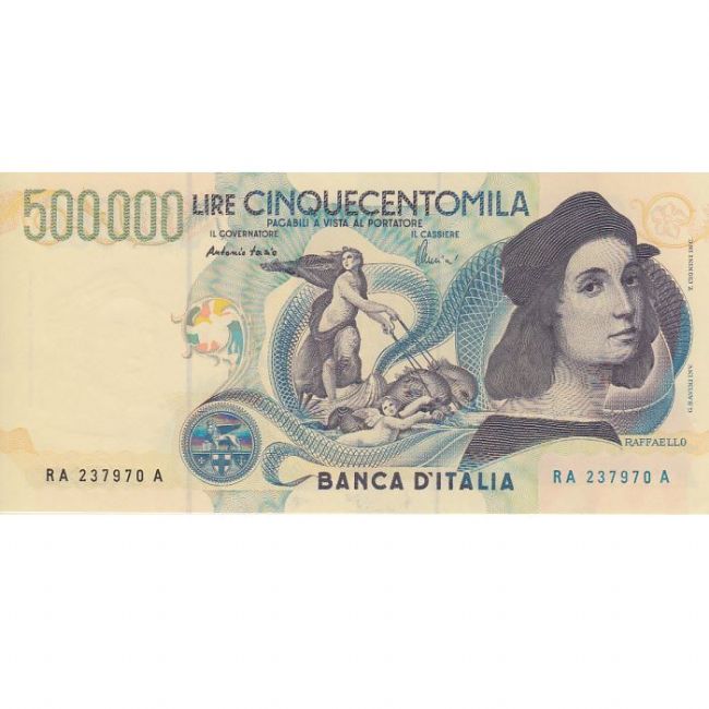 Banconota della Repubblica Italiana, taglio da 500.000 Lire Raffaello Sanzio. Emissione Banca d'Italia, anno 1997. Nel fronte a destra della banconota autoritratto di Raffaello Sanzio, al centro riproduzione dell'affresco "Il trionfo di Galatea" custodito nella Villa Farnesina in Roma, al retro la riproduzione dell'affresco "La scuola d'Atene" custodito dal Vaticano. Nella filigrana autoritratto di Raffaello. Monogramma "BI". Contrassegno di Stato Leone di San Marco e Repubbliche Marinare. Firme del Governatore e del Cassiere di Fazio-Amici.
