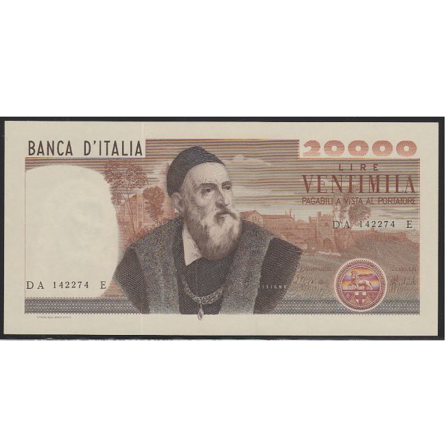 Banconota da 20.000 lire emessa dalla Repubblica Italiana nel 21-05-1975, firme del Governatore e Cassiere Carli-Barbarito. La banconota detta Tiziano reca al fronte mezzo busto di Tiziano Vecellio e paesaggio sullo sfondo, al retro riproduzione dell'opera Amor sacro e Amor profano del Tiziano, conservato nella Galleria degli Uffizi in Firenze. Contrassegno di Stato in basso a destra nel fronte della banconota riproduce Leone di San Marco e Repubbliche Marinare.