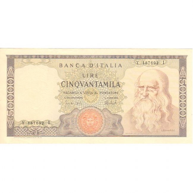 Banconota da 50.000 Lire del 16-05-1972 stampata dalla Banca d'Italia, Repubblica Italiana. Al fronte della banconota autoritratto di Leonardo da Vinci, al retro scorcio del borgo mediovale di Vinci. Contrassegno di Stato la Medusa, firme del Governatore e il Cassiere di Carli-Lombardi. Con il 50.000 Lire "Leonardo" e il 100.000 Lire "Manzoni", la Banca d'Italia per la prima volta approntò tagli così elevati.