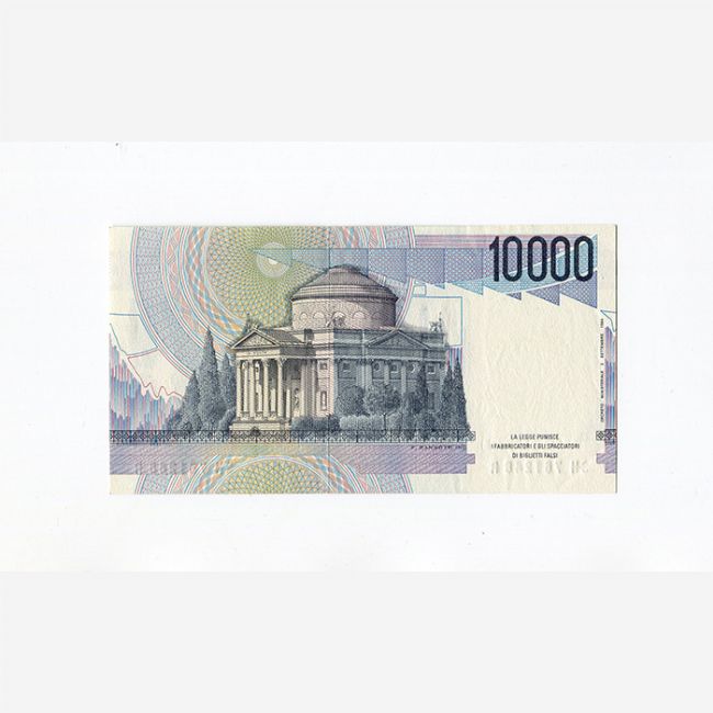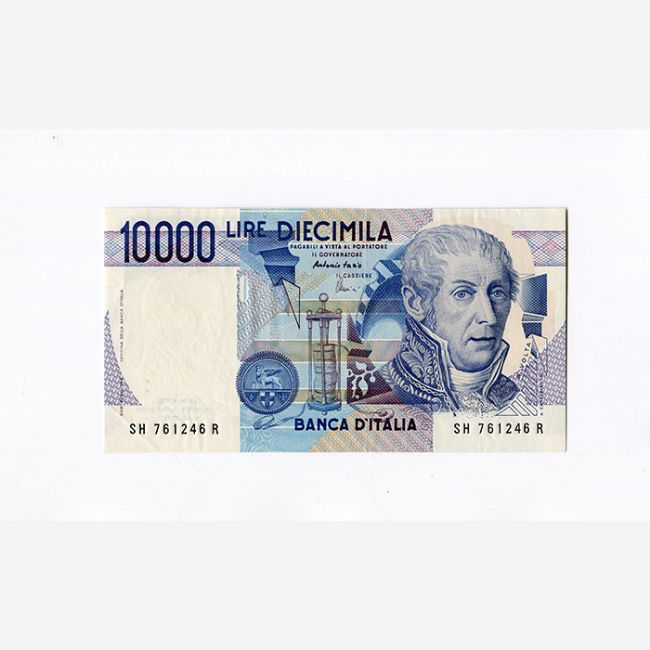 Repubblica Italiana,banconota da 10.000 lire "Alessandro Volta" anno emissione 1997,al dritto sulla parte destra della banconota busto di Alessandro Volta,presa dall'opera di Giovita Garavaglia conservata presso l'Istituto Nazionale per la Grafica in Roma,al retro la rappresentazione del Tempio Voltiano in Como costruito nel 1927 in occasione del centenario della morte dello scienziato.Caratteristiche della banconota:contrassegno di Stato con Leone di San Marco e Repubbliche Marinare,firme del Governatore e Cassiere:Fazio-Amici,la banconota stampata da:officina della Banca d'Italia,Roma.