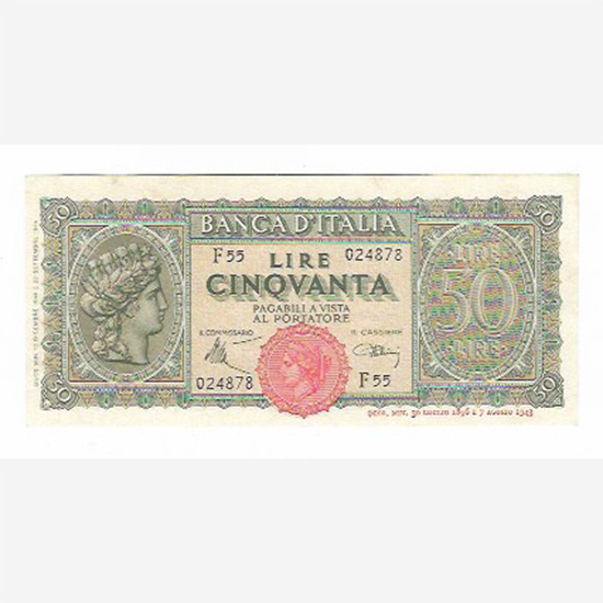 Luogotenenza, banconota da 50 lire Italia Turrita del 10-12-1944. Al dritto della banconota testa dell'Italia Turrita con stelle all'interno dell'ovale, al rovescio cifra 50 tra due monogrammi "B.I.". Firme: Introna-Urbini, filigrana: cifra 50 ripetuta 8 volte in tre righe orizzontali, contrassegni di Stato: al fronte della banconota la Testina d'Italia, al retro: monogramma "B.I", stampata dall'Istituto Poligrafico dello Stato, Roma. Fuori corso dal 30 giugno 1953.