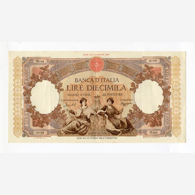 Repubblica Italiana, banconota da 10.000 Lire Regine del Mare, con data 27-10-1953. Al dritto della banconota al centro due maestosi figure femminili sedute, poggianti sugli stemmi delle città marinare Venezia e Genova, al rovescio nel medaglione centrale profilo idealizzato di Dante Alighieri con il capo cinto di foglie di alloro. Firme: Menichella-Urbini, filigrana: nell'ovale sinistro Michelangelo in quello destro la testa di Galileo, contrassegno di Stato: al fronte Medusa, al retro Monogramma, stampata dall'officina della Banca d'Italia, Roma. In circolazione dal 2 luglio 1951 e fuori corso dal 30 giugno 1969.