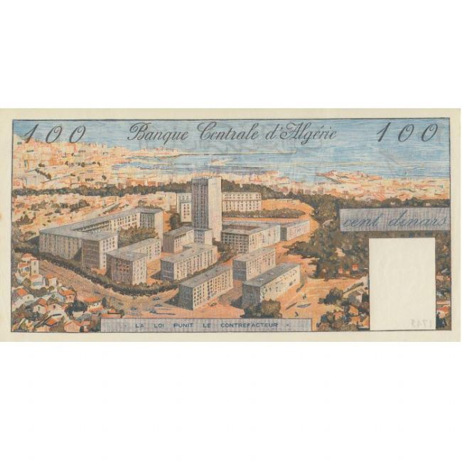Banconota da 100 Dinari Algerini emessa nel 1964. Nel fronte della banconota immagine del Porto di Algeri, al retro della cartamoneta immagine di un moderno complesso edilizio, in alto lascritta Banque Centrale d'Algerie.