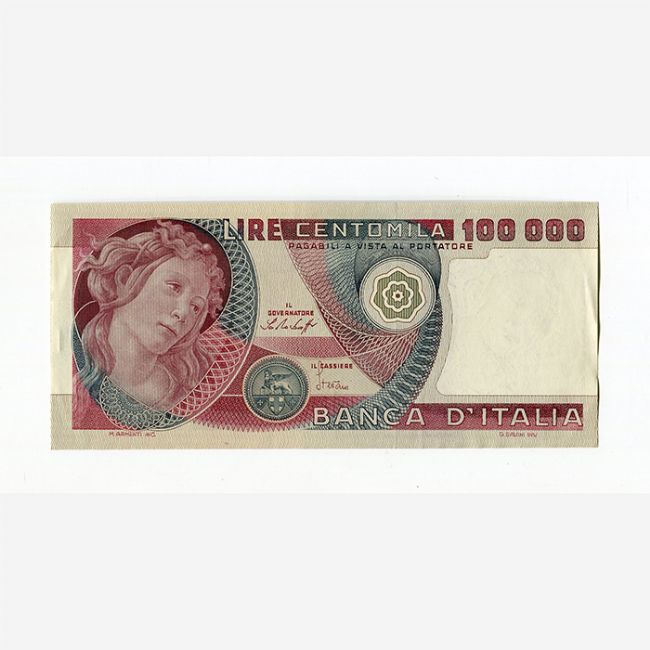 Repubblica Italiana, banconota da 100.000 Lire Primavera di Botticelli, con data 20-06-1978. Al dritto della banconota volto femminile tratto da una delle Grazie del celebre dipinto del Botticelli "La Primavera", al rovescio disegni architettonici. Firme: Baffi-Stevani, filigrana: nel riquadro testa femminile, contrassegno di Stato: al fronte Leone di San Marco e Repubbliche Marinare, stampata dall'officina della Banca d'Italia, Roma. In circolazione dal 20 novembre 1978 e fuori corso il 21 marzo 1988.