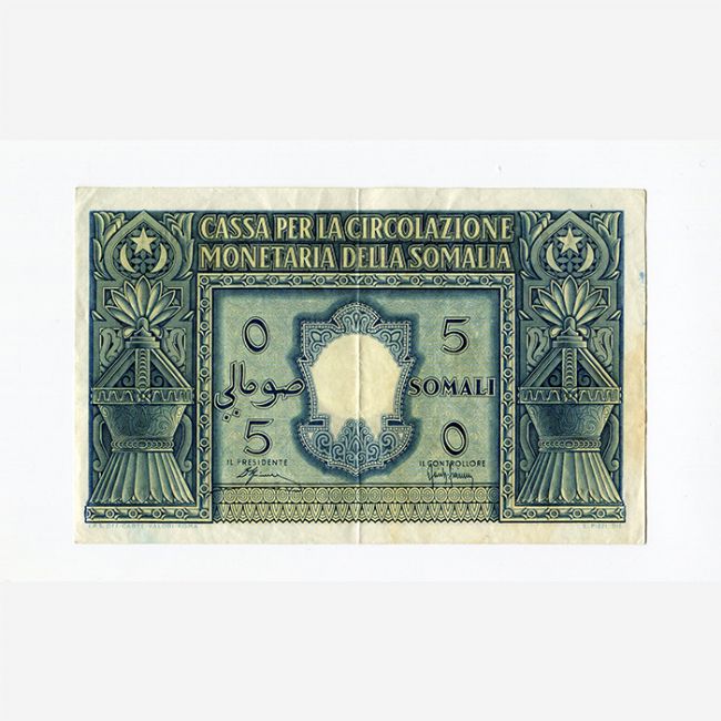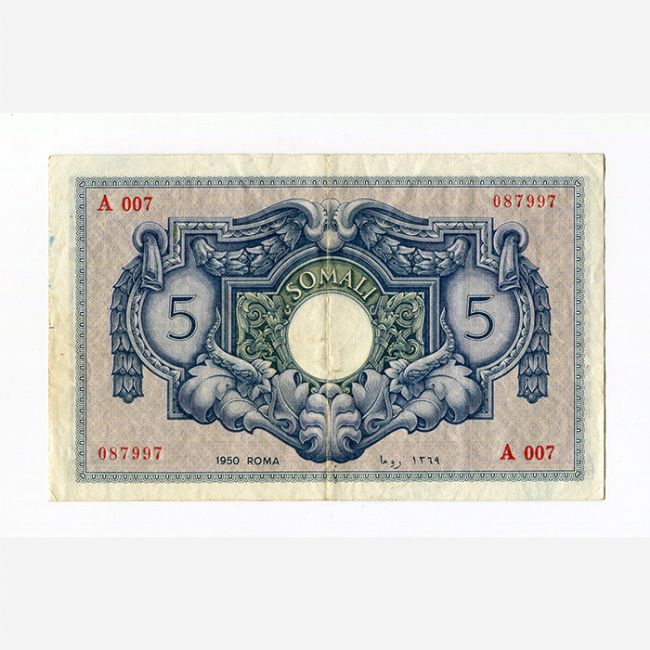 Cartamoneta Italiana, Amministrazione Fiduciaria Italiana della Somalia (AFIS), cassa per la circolazione monetaria della Somalia, banconota da 5 Somali anno 1950. Al fronte della banconota motivi allegorici rappresentati la cultura araba, le firme Spinelli-Giannini. Al retro la cifra 5 entro cornice in stile Liberty. Filigrana: nel centro dell'ovale testa di elefante e scritta SOMALO ripetuta più volte. Il 21 novembre 1949 l'assemblea generale delle Nazioni Unite ritenne necessario porre in amministrazione provvisoria la Somalia, l'incarico fu affidato all'Italia, fu creata nel 1950 l'Amministrazione Fiduciaria Italiana della Somalia (AFIS) e istituita la monetazione sia metallica sia cartacea.