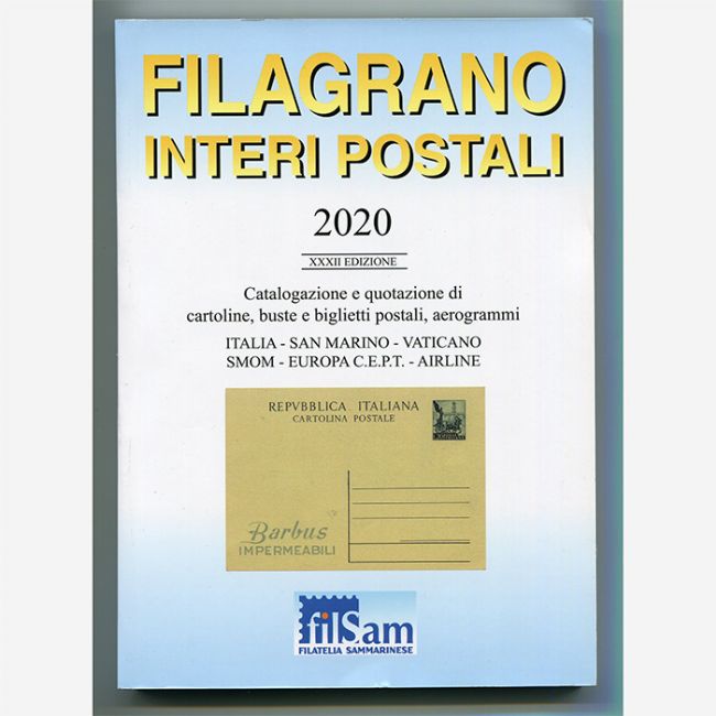 Catalogo Filagrano per gli Interi Postali, XXXI edizione, anno 2020. Catalogo specializzato con foto a colori, con valori, informazioni e accenni storici, indispensabile per la catalogazione e quotazione di: cartoline, buste e biglietti postali, aerogrammi, vaglia, bollettini pacchi, buoni risposta internazionale, franchigie militari, prigionieri di guerra, folder, viaggi di giovanni Paolo II. Paesi trattati: Italia, San Marino, Città del Vaticano, Sovrano Militare Ordine di Malta, Europa C.E.P.T., Airline