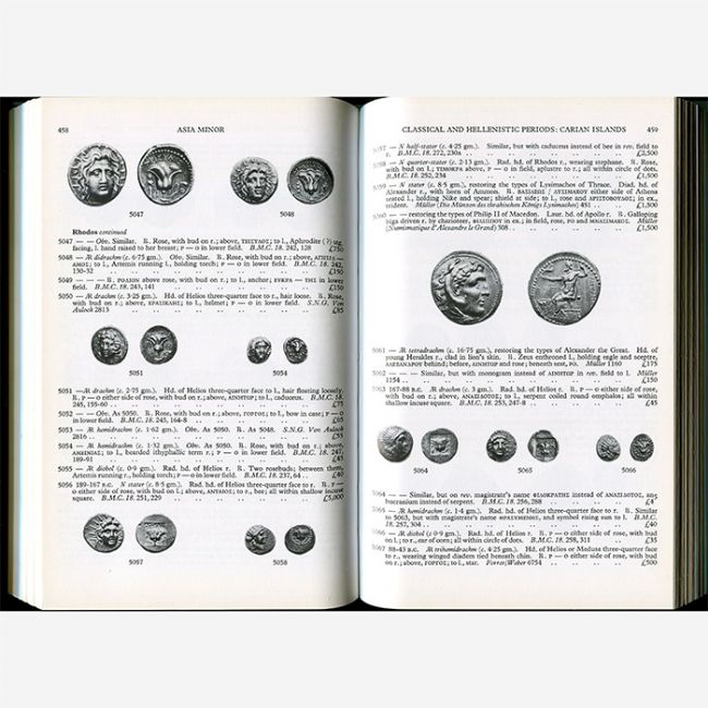 Greek Coins and their values, catalogo per la valutazione e catalogazione delle coniazioni principali di monete antiche Greche, volume 2° Asia e Africa, con prezzi, illustrazioni, foto e note storiche. La prima parte del catalogo è dedicata alle prime monete in elettro della Ionia e della Lidia, e le susseguenti monetazioni autonome delle città stato dell'Asia minore insieme alle monete coniate sotto il comando Persiano dell'era preallesandrina. Inoltre il volume copre le coniazioni delle città dell'est della Grecia, della Siria e della Fenicia, sino alla Babilonia e Baktria. Include ancora il Nord Africa comprese le importanti zecche Kirene e di Cartagine. La sezione finale del catalogo è dedicata alle emissioni delle principali regni dell'era Ellenistica, terminando con Cleopatra VII di Egitto la cui morte ha portato alla fine della dinastia Tolomaica in Egitto. All'interno del volume ci sono più di 4500 monete catalogate con quasi 2000 fotografie e 4 tavole alfabetiche e 11 mappe, con un indice generale.