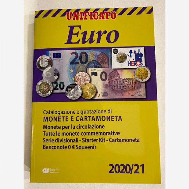 Catalogo per monete Euro, Unificato edizione 2020/2021, indispensabile per la catalogazione e quotazione delle monete e cartamoneta dei paesi appartenenti all'euro. All'interno del catalogo troverete con foto a colori tutte le monete circolanti e commemorative, le serie divisionali, starters kits, cartamoneta degli stati con monetazione euro e banconote 0 €.Souvenir, tutto con descrizioni dettagliate e prezzi.