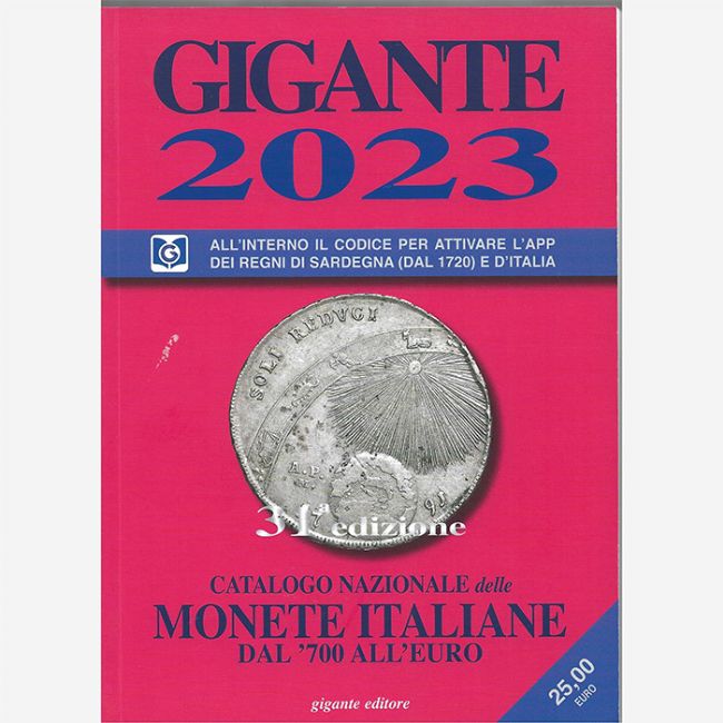 Catalogo nazionale delle monete Italiane dal 700 all'euro, edizione Gigante valutazione monete anno 2023. All'interno del catalogo accenni storici foto a colori e valutazione di monete singole e serie complete riguardanti: Regno di Sardegna, Re Eletto, Regno d'Italia, Colonie Italiane, Regno d'Albania, RSI, Piemonte, Napoleone I Bonaparte, Monetazione Ossidionale, Liguria, Ducato di Milano e Mantova, Lombardia-Veneto, Regno Lombardo Veneto, Governi Provvisori, Emilia, Ducato di Parma Piacenza e Guastalla, Granducato di Toscana, Regno d'Etruria, Principato di Lucca e Piombino, Ducato di Lucca, Repubbliche Romane, Stato Pontificio, Campania, Regno di Napoli, Antichi Presidi di Toscana, Regno delle due Sicilie, Regno di Sicilie, Repubblica Italiana, AFIS, Repubblica di San Marino, Stato della Città del Vaticano.