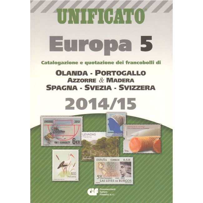 Catalogo per francobolli Europa volume 5 edizione 2014-2015, indispensabile per la catalogazione e quotazione dei francobolli di OLANDA, PORTOGALLO, AZZORRE E MADERA, SPAGNA, SVEZIA, SVIZZERA. Il catalogo riporta tutte le immagini delle emissione filateliche emesse con informazioni e prezzi.