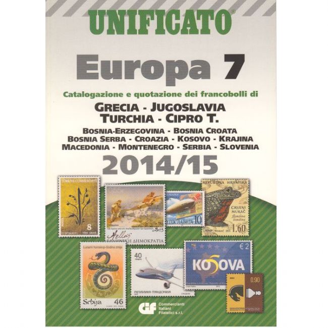 Catalogo per francobolli Europa volume 7 edizione 2014-2015, indispensabile per la catalogazione e quotazione dei francobolli di GRECIA, JUGOSLAVIA, TURCHIA, CIPRO TURCA, BOSNIA ERZEGOVINA, BOSNIA CROATA, BOSNIA SERBA, CROAZIA, KOSOVO, KRAJINA, MACEDONIA, MONTENEGRO, SERBIA, SLOVENIA. Il catalogo riporta tutte le immagini delle emissione filateliche emesse con informazioni e prezzi.