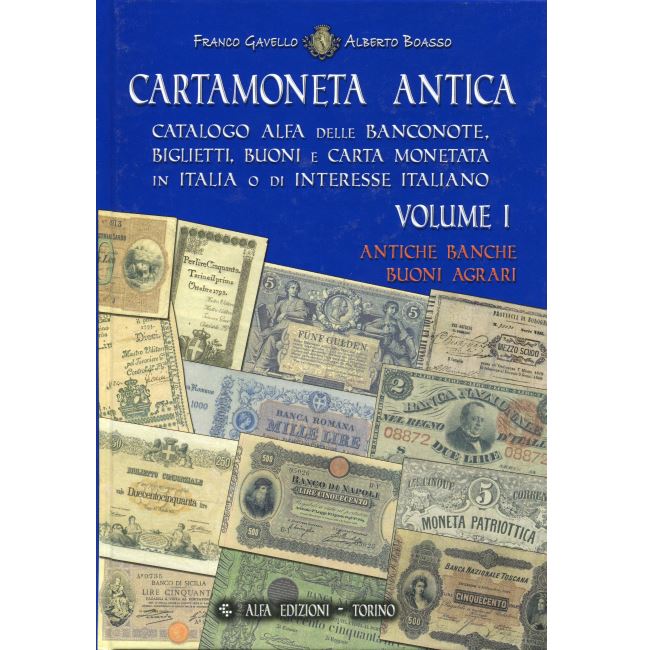 Catalogo edizione Alfa delle Banconote, Biglietti, Buoni e Carta Moneta in Italia o di interesse Italiano, Antiche Banche e Buoni Agrari. Volume I. La presente opera (si compone di 5 volumi), prende in esame, classifica e descrive tutte le emissioni cartacee conosciute, dal nascere della cartamoneta nell'Italia preunitaria sino ai tempi recenti, ideale per la catalogazione e quotazione delle banconote.