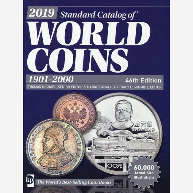 World Coins, catalogo per la valutazione delle monete mondiali dal 1901 al 2000, 46^ edizione anno 2019. All'interno del catalogo foto, note caratteristiche e valore in vari stati di conservazione di tutte le monete del mondo emesse dal 1900 al 2000.