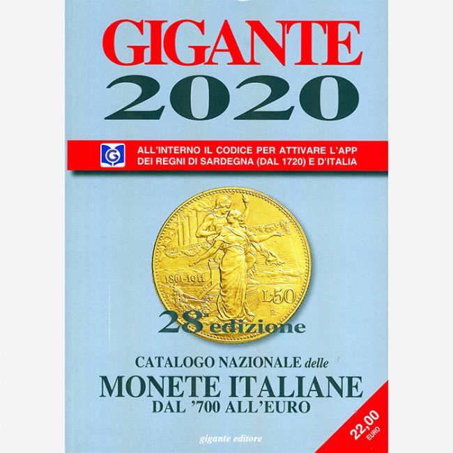Catalogo nazionale delle monete Italiane dal 700 all'euro, 28 edizione Gigante anno 2020. All'interno del catalogo accenni storici foto a colori e valutazione di monete singole e serie complete riguardanti: Regno di Sardegna, Re Eletto, Regno d'Italia, Colonie Italiane, Regno d'Albania, RSI, Piemonte, Napoleone I Bonaparte, Monetazione Ossidionale, Liguria, Ducato di Milano e Mantova, Lombardia-Veneto, Regno Lombardo Veneto, Governi Provvisori, Emilia, Ducato di Parma Piacenza e Guastalla, Granducato di Toscana, Regno d'Etruria, Principato di Lucca e Piombino, Ducato di Lucca, Repubbliche Romane, Stato Pontificio, Campania, Regno di Napoli, Antichi Presidi di Toscana, Regno delle due Sicilie, Regno di Sicilie, Repubblica Italiana, AFIS, Repubblica di San Marino, Stato della Città del Vaticano.