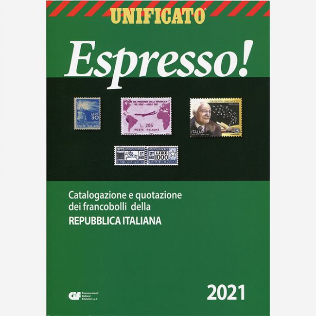 Catalogo Espresso 1^ edizione, Unificato anno 2021, per la quotazione e catalogazione dei francobolli della Repubblica Italiana. All'interno del catalogo foto a colori, quotazioni e cenni storici di tutti i francobolli emessi dalla Repubblica Italiana dal 1945 al 2020, francobolli ordinari, posta celere, libretti, recapito autorizzato, pacchi postali, pacchi in concessione, segnatasse, riepilogo annate complete, riepilogo delle emissioni congiunte.