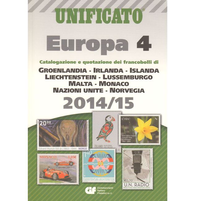 Catalogo per francobolli Europa volume 4 edizione 2014-2015, indispensabile per la catalogazione e quotazione dei francobolli di GREOLANDIA, IRLANDA, ISLANDA, LIECHTENSTEIN, LUSSEMBURGO, MALTA, MONACO, NAZIONI UNITE, NORVEGIA. Il catalogo riporta tutte le immagini delle emissione filateliche emesse con informazioni e prezzi.