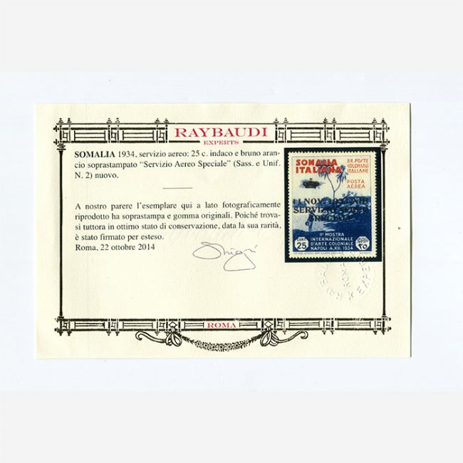 francobollo servizio aereo 25 centesimi indaco e bruno arancio sovrastampato "Servizio Aereo Speciale", nuovo con gomma integra. Francobollo dotato di certificato oro di autenticità Raybaudi.