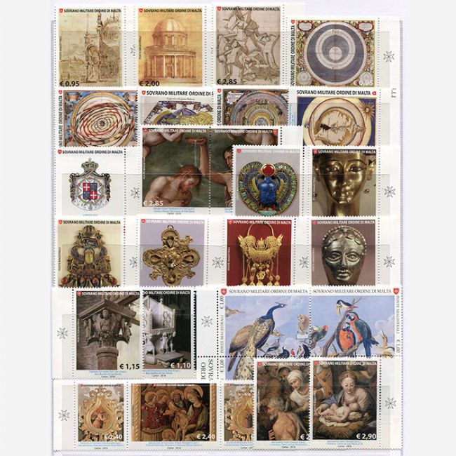Annata di francobolli nuovi emessi dal Sovrano Militare Ordine di Malta (S.M.O.M.) anno 2018. L'annata è composta da 32 francobolli e 5 foglietti, 1 minifoglio da 9 valori e 1 da 12 valori. I foglietti commemorano: Annunciazione del G.B.Pittoni, Evangeliario con Cristo, presepio del Bernardino Gatti, Battesimo di Cristo del Giorgio Vasari, Trittico Rospigliosi di Bartolomeo di Tommaso, il minifoglio da 9 francobolli: Publio Virgilio Marrone l'Eneide, il minifoglio da 12: il ciclo dei Mesi di Benedetto Antelami.