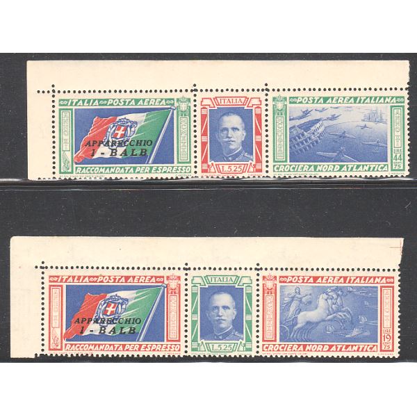 Crociera Nord Atlantica del Decannale. Serie francobolli Trittici posta aerea emessi il 20 maggio 1933. Serie di francobolli composta da 2 valori. Trittici formati da un'etichetta di raccomandata espresso col nome dell'apparecchio (I - BALB), da un francobollo di posta ordinaria e da un francobollo di posta aerea. Soggetto del primo trittico bandiera italiana con soprastampa della sigla dell'apparecchio, effigie di Vittorio Emanuele III e idrovolanti in volo tra il colosseo e i grattacieli di Chicago. Nel secondo trittico bandiera italiana con soprastampa della sigla dell'apparecchio, effigie di Vittorio Emanuele III e il carro del sole da un tondo dell'Arco di Costantino a Roma.